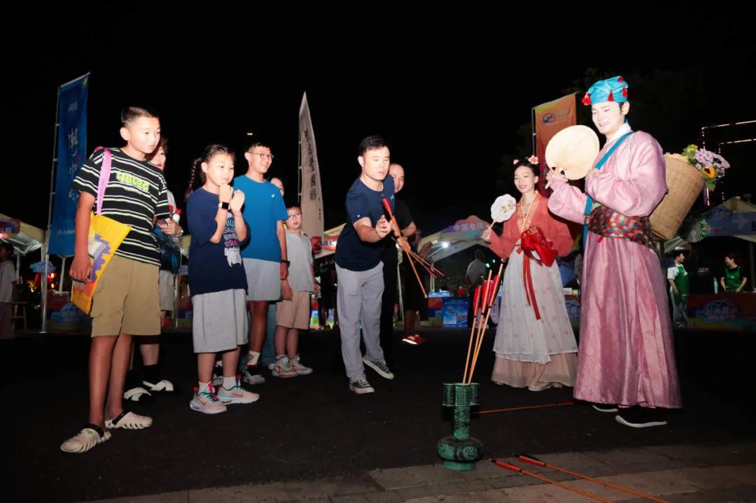 在“一起来‘嘉游精彩‘篮’不住”浙ba嘉兴文旅嘉年华现场,身着汉服的卖花郎与卖花女npc漫步其中,卖花郎手持写有“善”字的扇子,卖花女轻提花灯,两人共同插着小国旗,宛如穿越时空而来。