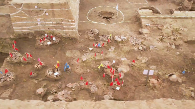 遗址内还发现了越国高等级祭祀遗迹,祭祀沟内发现密集覆盖有编织物的印纹硬陶坛、罐、杯等祭祀用器。