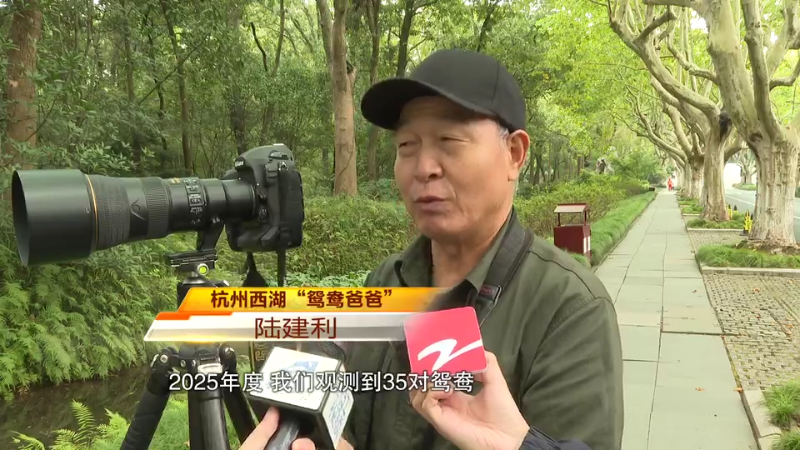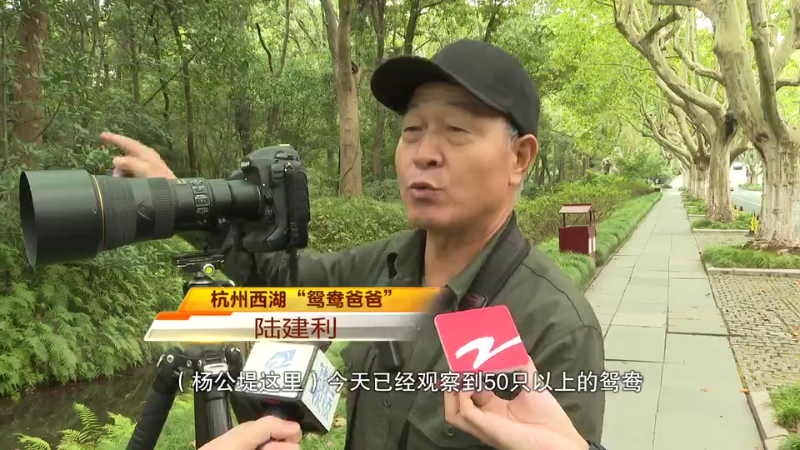 陆建利已经连续9年观察西湖边的各种鸟类了,对于它们的习性非常了解。这一群,都是从北方来西湖过冬的野生鸳鸯,而因为今年前期一直较热,所以它们比往年至少迟来了一周左右。陆建利还告诉记者,在杭州的本土鸳鸯,今年总共有220~230只左右,这个数字再创历史新高。